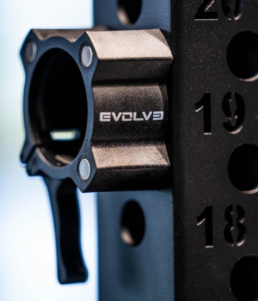The Evolve Olympic Bar Collars are designed for secure and efficient weightlifting. They feature a one-hand operation for ease of use, and are constructed with a durable nylon frame and elastomeric pads for equipment protection. Weighing only 0.4 kg and fitting standard Olympic bars with a 50 mm keyhole diameter, these collars are ideal for both home and commercial gyms.