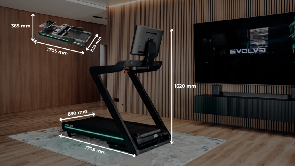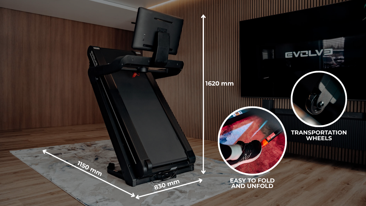 After each workout, effortlessly fold the treadmill and transfer it to another location using the built-in transportation wheels. It’s a practical space-saving solution that seamlessly fits into any home gym setup.