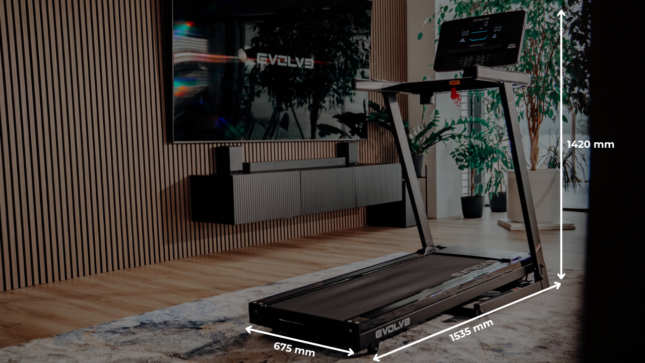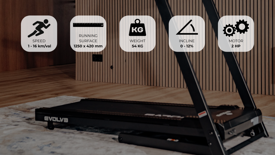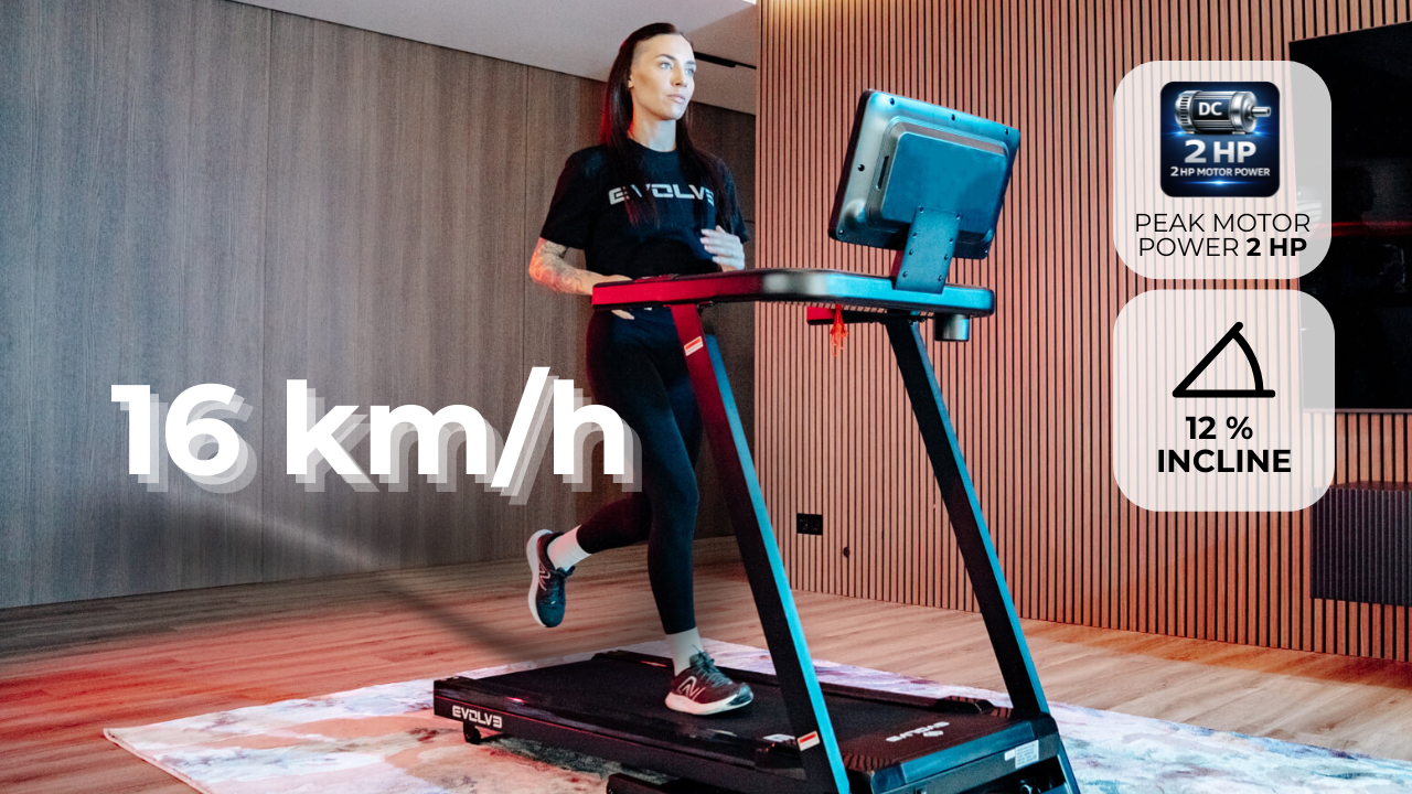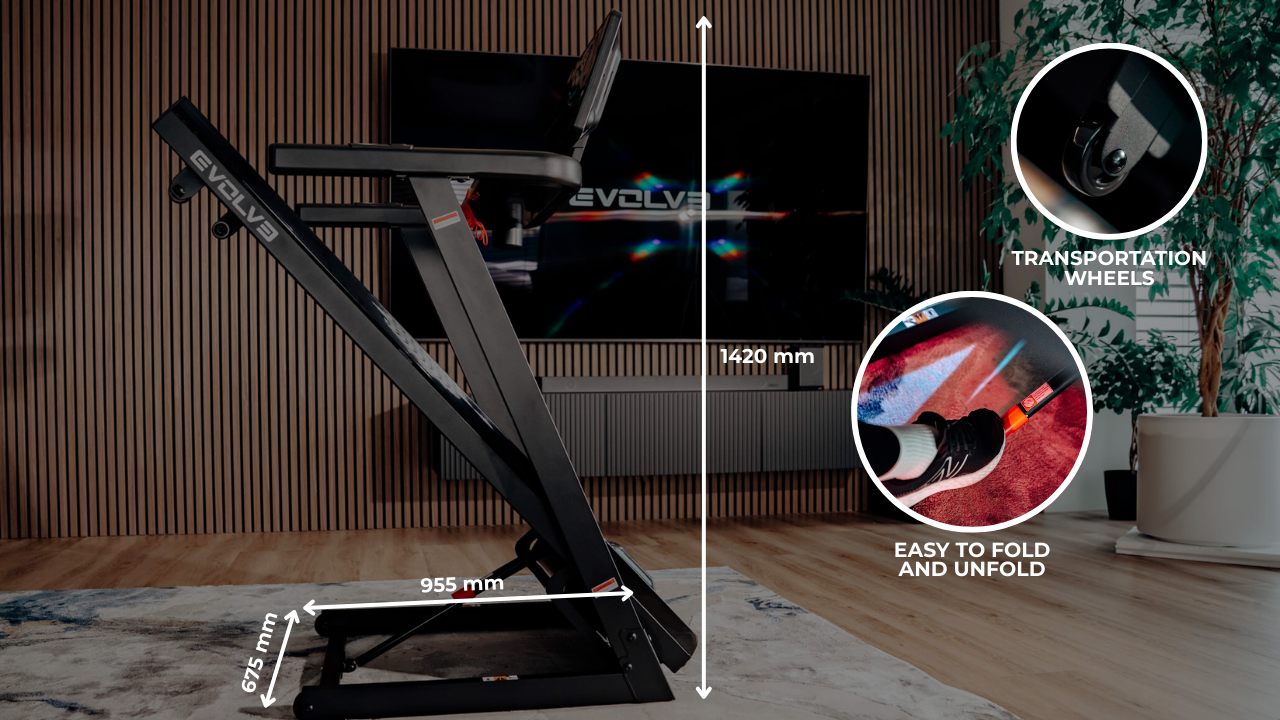 The Evolve Treadmill with LED Console (EV-TM-HT-175-LED) is a compact and durable cardio machine with a 1250 × 420 mm running surface, 1.0–16.0 km/h speed range, 12 incline levels, and multiple workout programs. Its folding design with transport wheels makes it easy to store and move, making it perfect for home use.